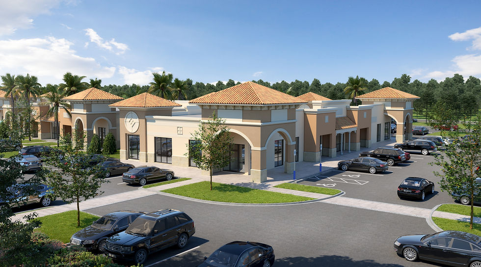 Commercial retail center in Estero, Florida featuring multi-tenant layout, Mediterranean architecture, and integrated parking design by South Florida Architecture.